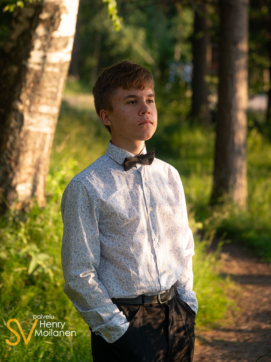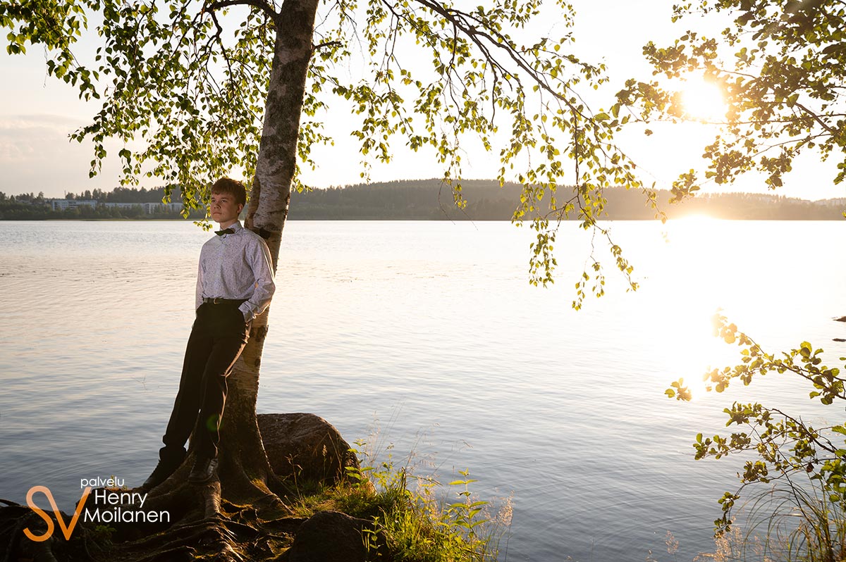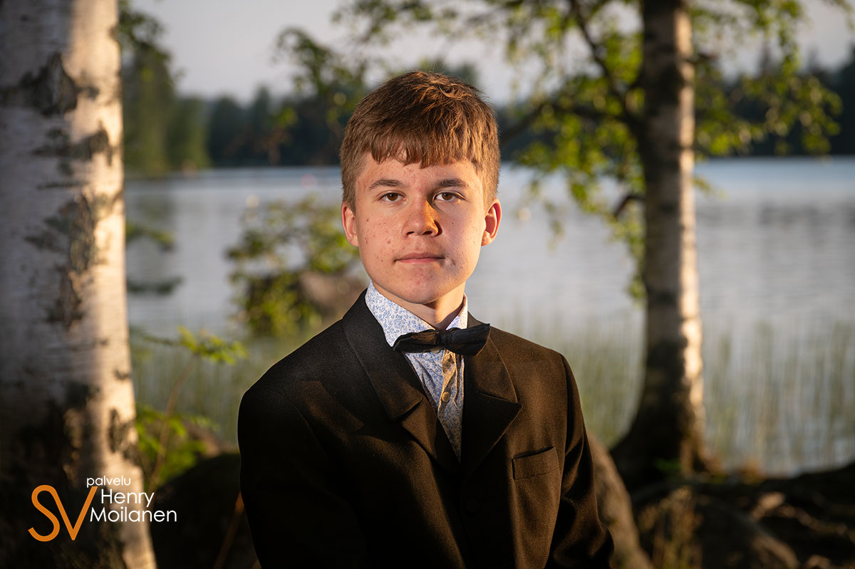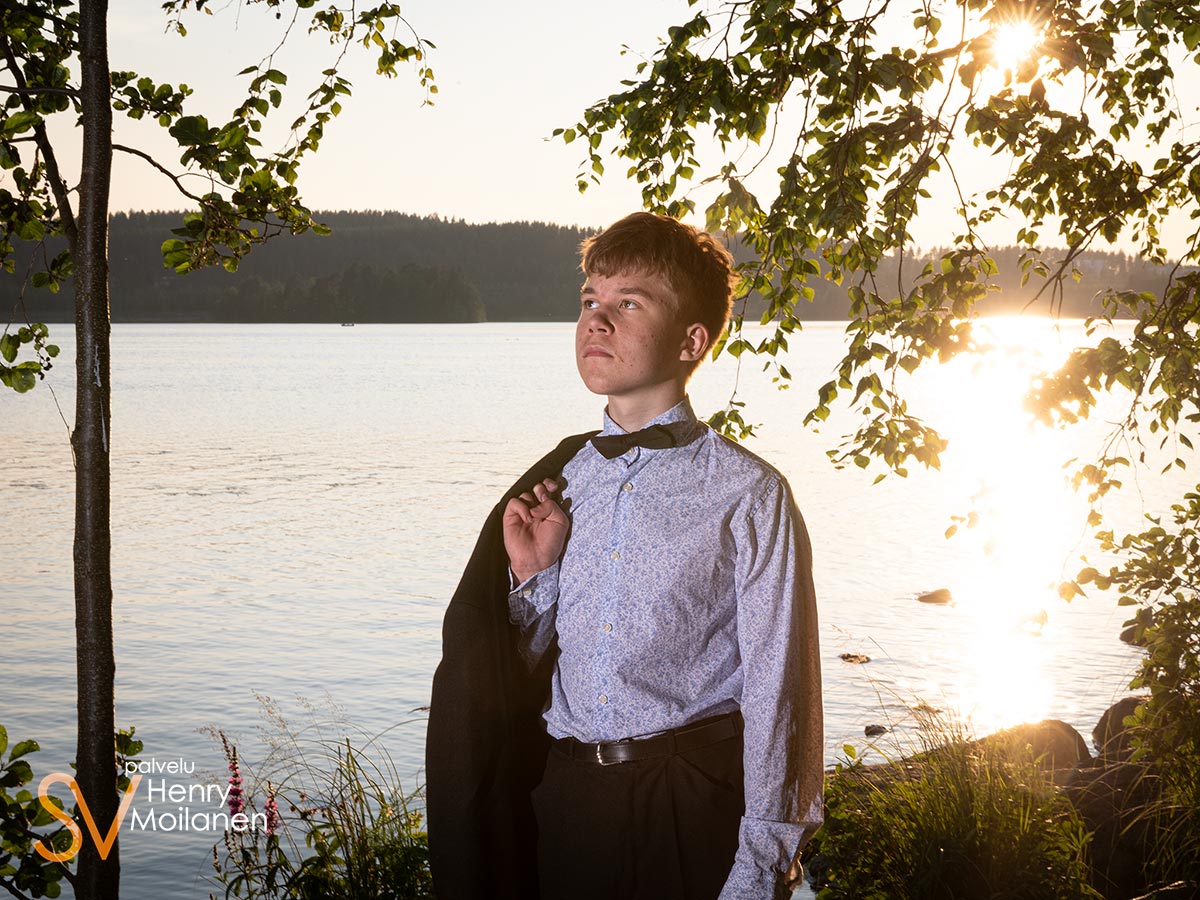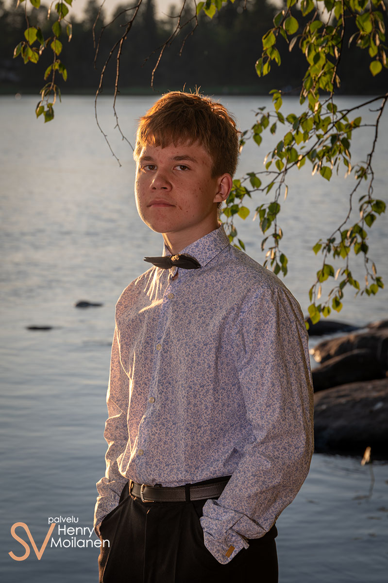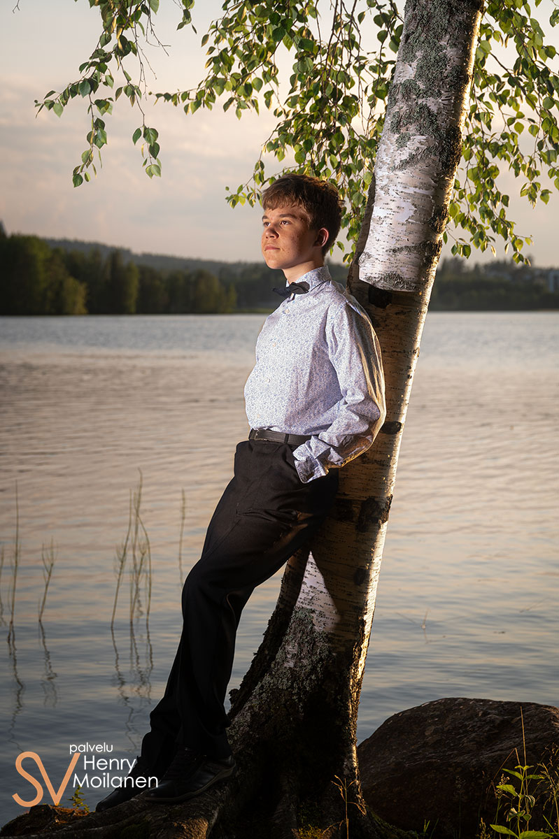 Tämä nuorimies halusi olla kuvissa oma itsensä, ilman ilmeilyjä tai pakkohymyjä. Niinpä kuvattiin Palokkajärven rantamaisemissa komeassa auringonlaskussa rippipotretteja.