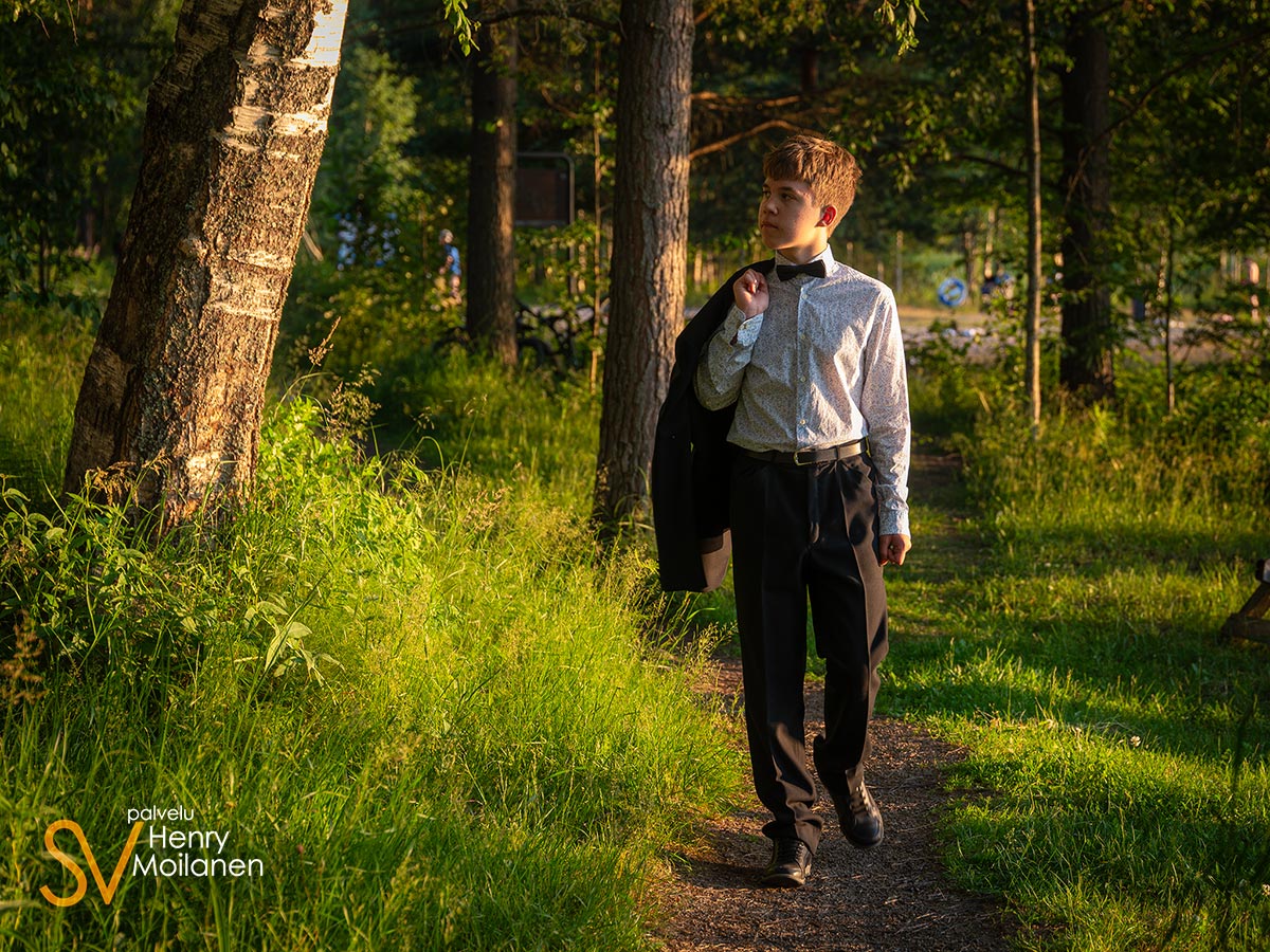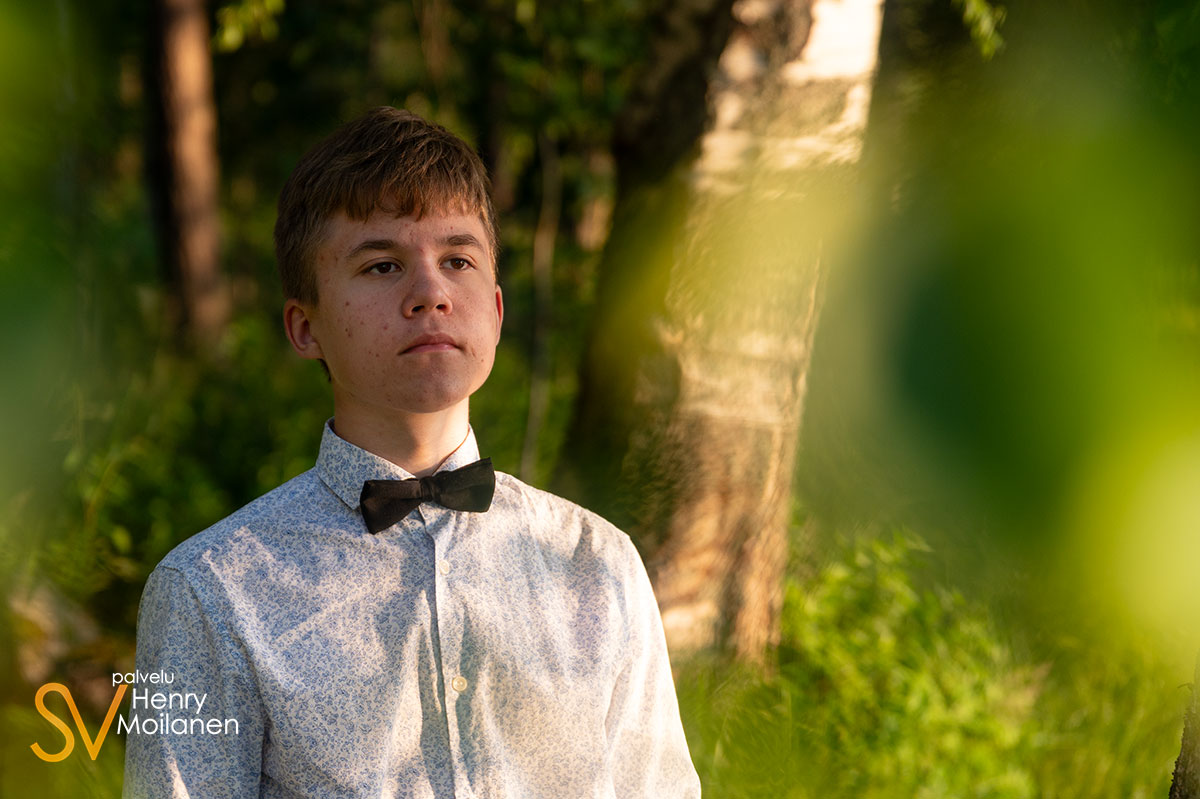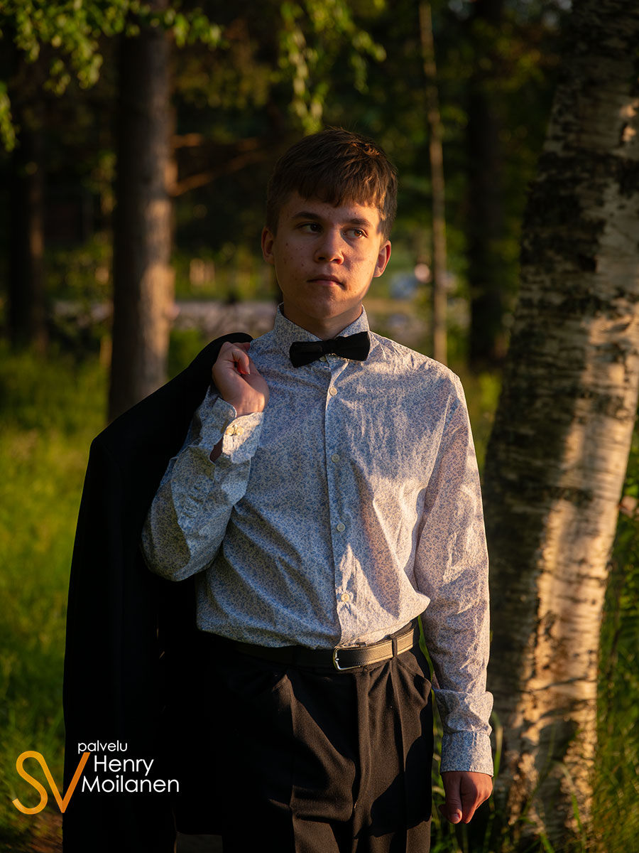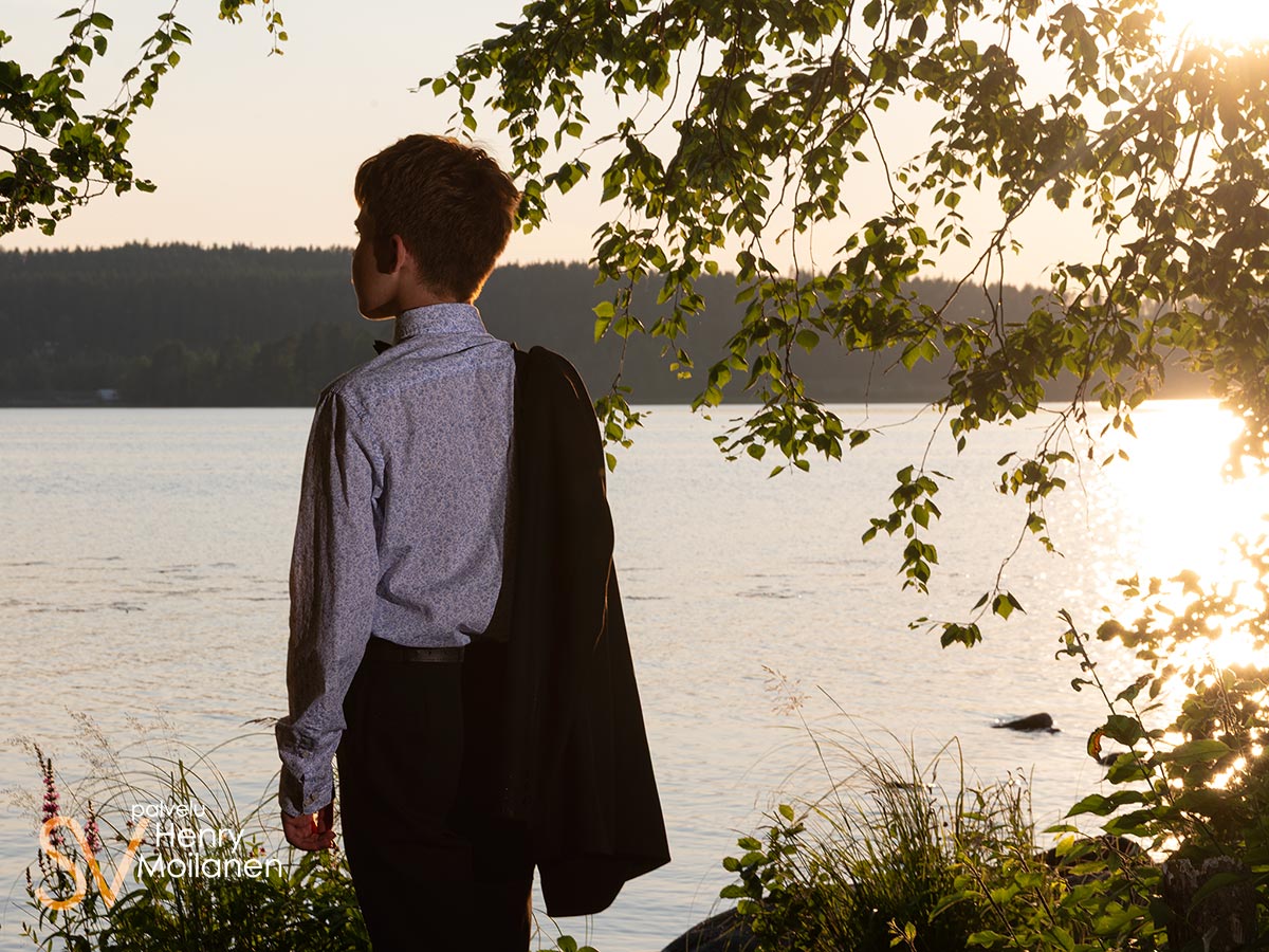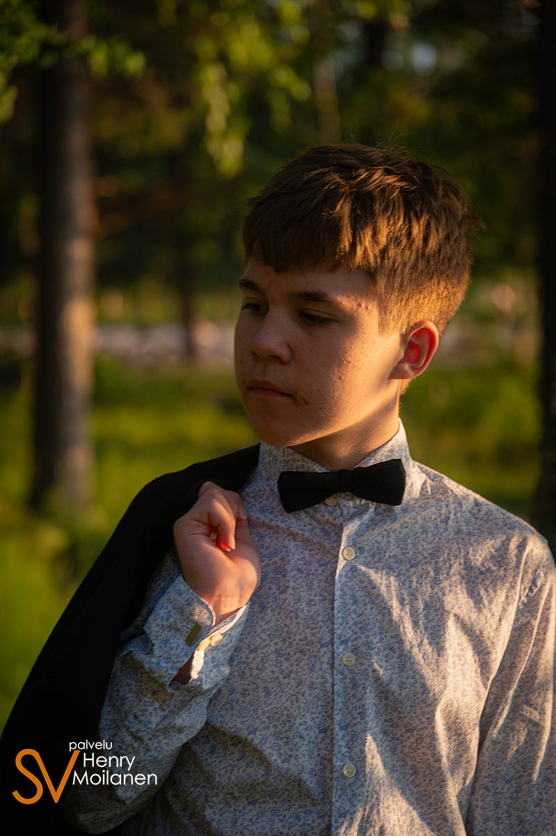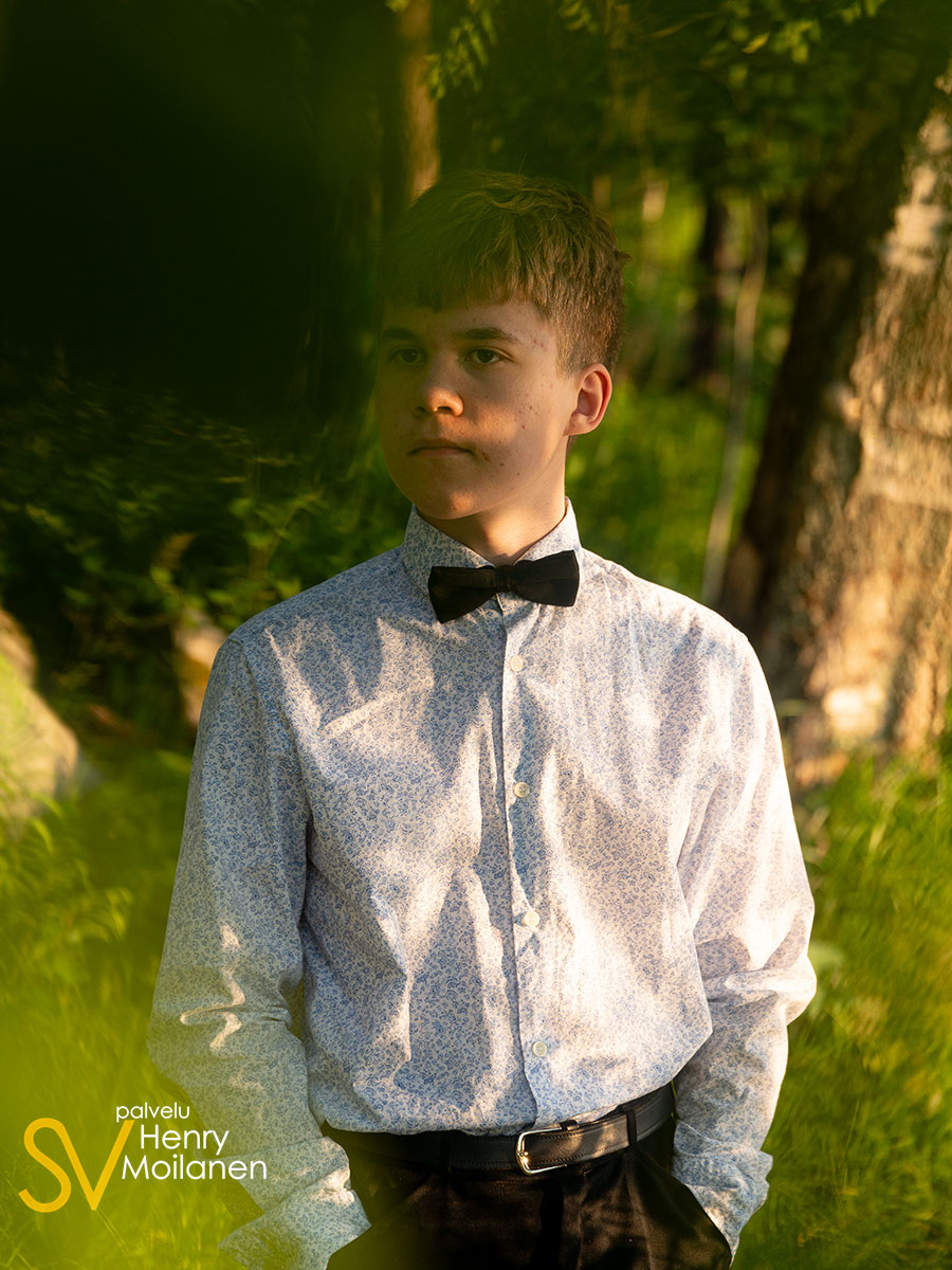Tämä nuorimies halusi olla kuvissa oma itsensä, ilman ilmeilyjä tai pakkohymyjä. Niinpä kuvattiin Palokkajärven rantamaisemissa komeassa auringonlaskussa rippipotretteja.