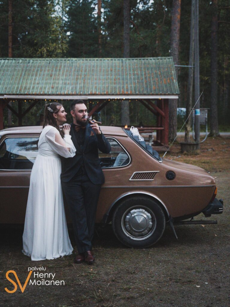 Hääjuhlaa vietettiin nuoriseurantalo Männistössä, Keuruulla. Iso punainen hirsitalo tarjosin omanlaisen juhlatilan hääseurueelle. Hieman hämärää, mutta pääosin kuvasin ilman salamavaloa. Pihalla otettiin myös ryhmäkuvia dokumentaarisen kuvauksen ohessa. Loppuillasta sulhanen esitteli sikareitaan, josta kuvaaja nappasi idean kuviin hääauton kanssa. Joskus pitää vain hieman heittäytyä, vaikkei lopputulemasta tiedä. No, hyviähän niistä tuli!
