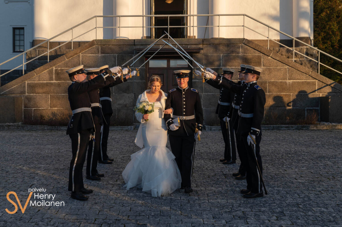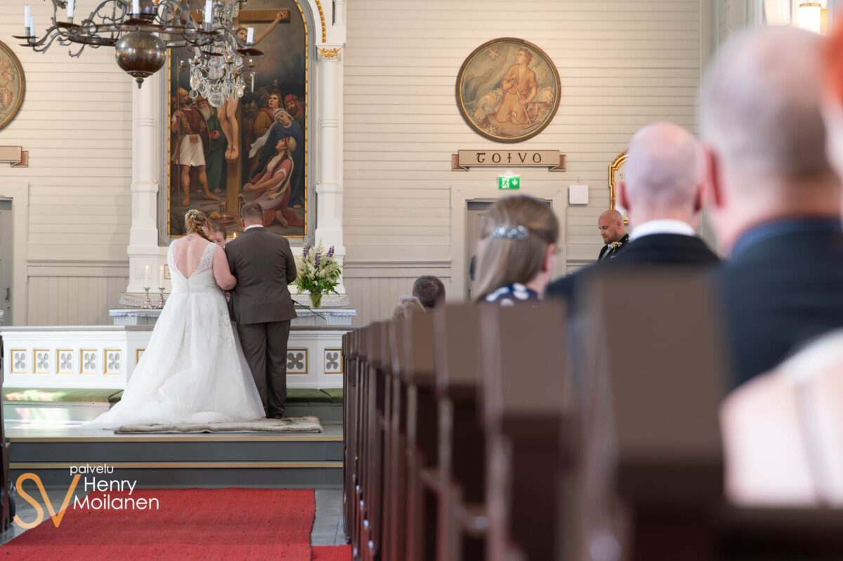 Vihkiminen alkoi pian potrettikuvien jälkeen, kun häävieraita alkoi saapua sisään. Hääpari häipyikin valmistautumaan ja hääkuvaaja keskittyi dokumentaariseen kuvaamiseen. Vihkimisen tärkeimmät hetket tallennettiin kuviin ja lopuksi kirkon pihamaalla odotti hääparia miekkakuja. Miekkakujan edessä otimme viimeisen parikuvan, johon kuvaus myös päättyi. Hääseurue siirtyi hääjuhlaan viereiselle seurakuntakodille.