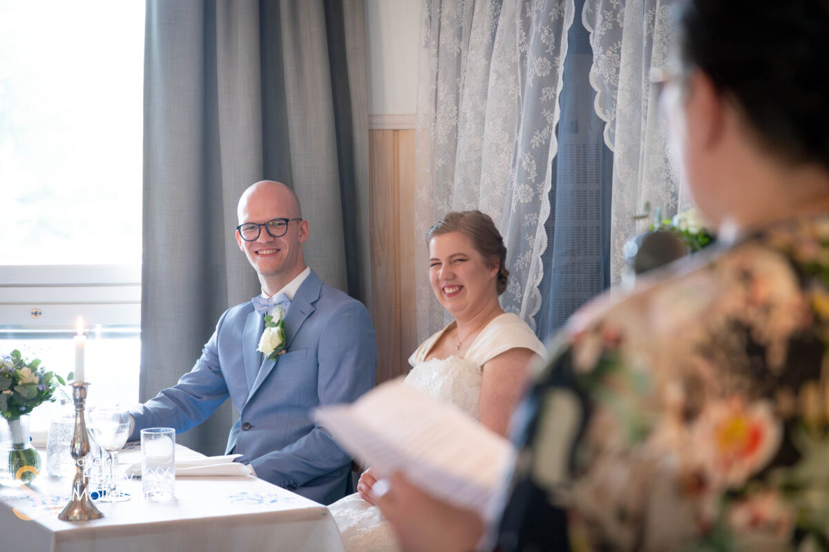 Hieman ennen vihkimistä taivas repesi ja kasteli kirkon ympäristön täysin. Onneksi olimme kuvanneet potretit tovi aiemmin, joten hääpari odotteli sisätiloissa h-hetkeä. Vihkiminen kesti noin 30 minuuttia, jonka aikana sade olikin jo tauonnut. Kohti juhlapaikkaa!