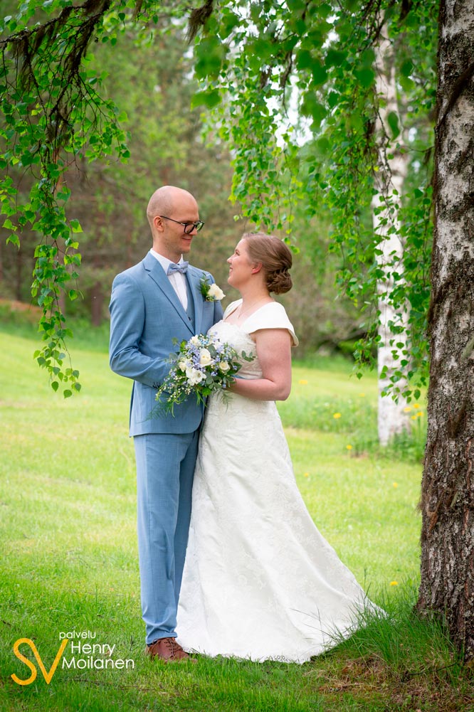 Kuvaus aloitettiin Koskenpään kirkon pihassa 1,5 tuntia ennen vihkimistä, jotta ei tule liian kiire hääpotrettien kanssa. Koskenpään kirkkomiljöö oli puistomainen, mutta hyödynsimme paria koivua kesäisen raikkauden kuviin saamiseksi. Parilla ei ollut mitään etukäteistoiveita kuville.